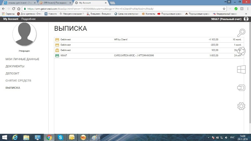 Тема заработка на курсах валют для меня всегда была актуальна, и я перепробовал множество брокеров, пока не остановился на Gebinvest. Изначально меня отпугивали несколько негативных отзывов, но реальная торговля показала что они беспочвенны. Вся финансовая система кристально прозрачна. Торгую с ними уже несколько месяцев на USD\CADи EUR\USD, и менятьпока не собираюсь. Очень достойный брокер, с которым можно смело работать, не задумываясь о рисках.